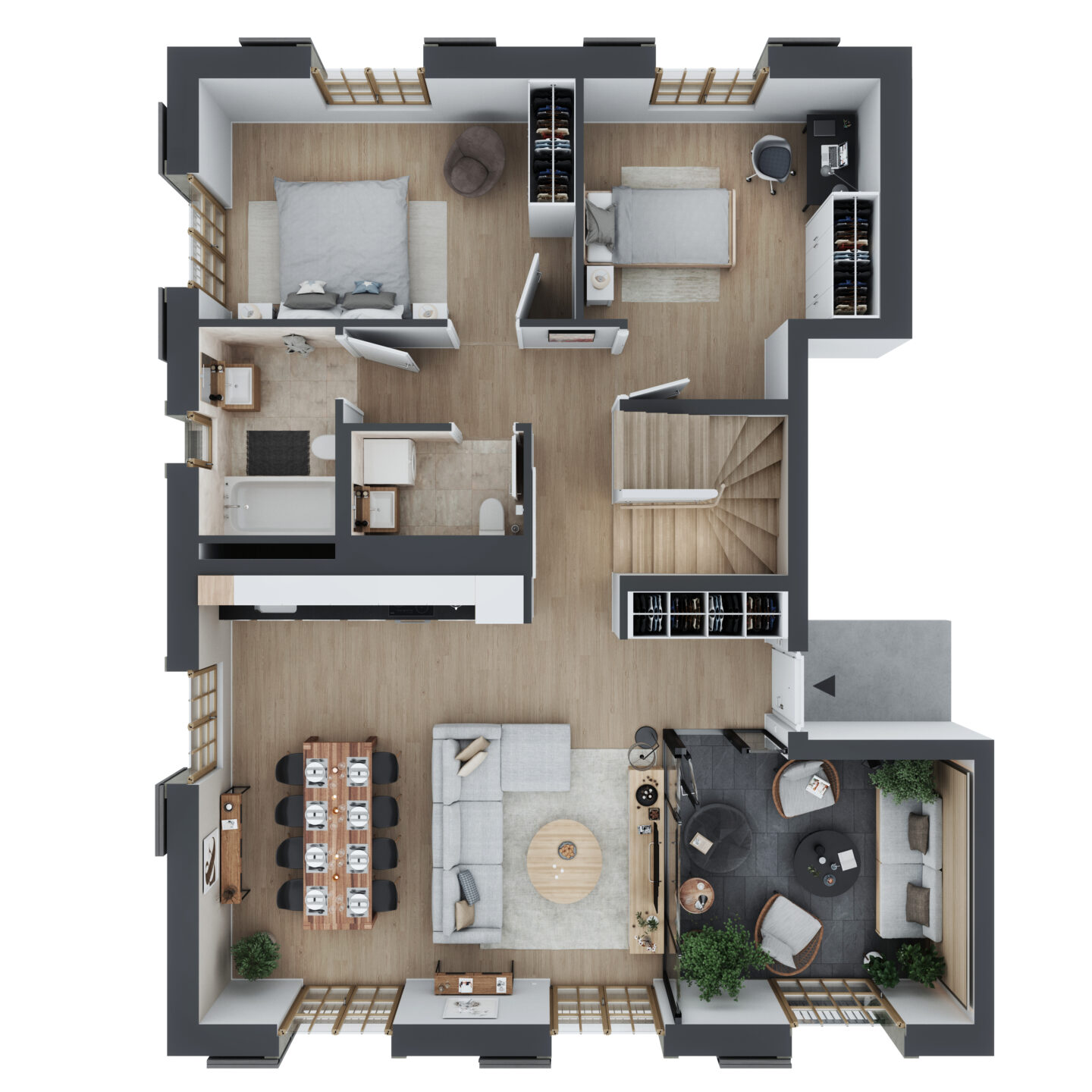 Le bâtiment B accueille également 4 appartements, deux simplex en rez-de-jardin, ainsi que deux duplex répartis entre le 1er étage et les combles. Profitant d’une orientation plein Sud et situé en plein cœur de la parcelle, il profite d’un ensoleillement exceptionnel et d’un dégagement sur les vignes et sur le Salève.