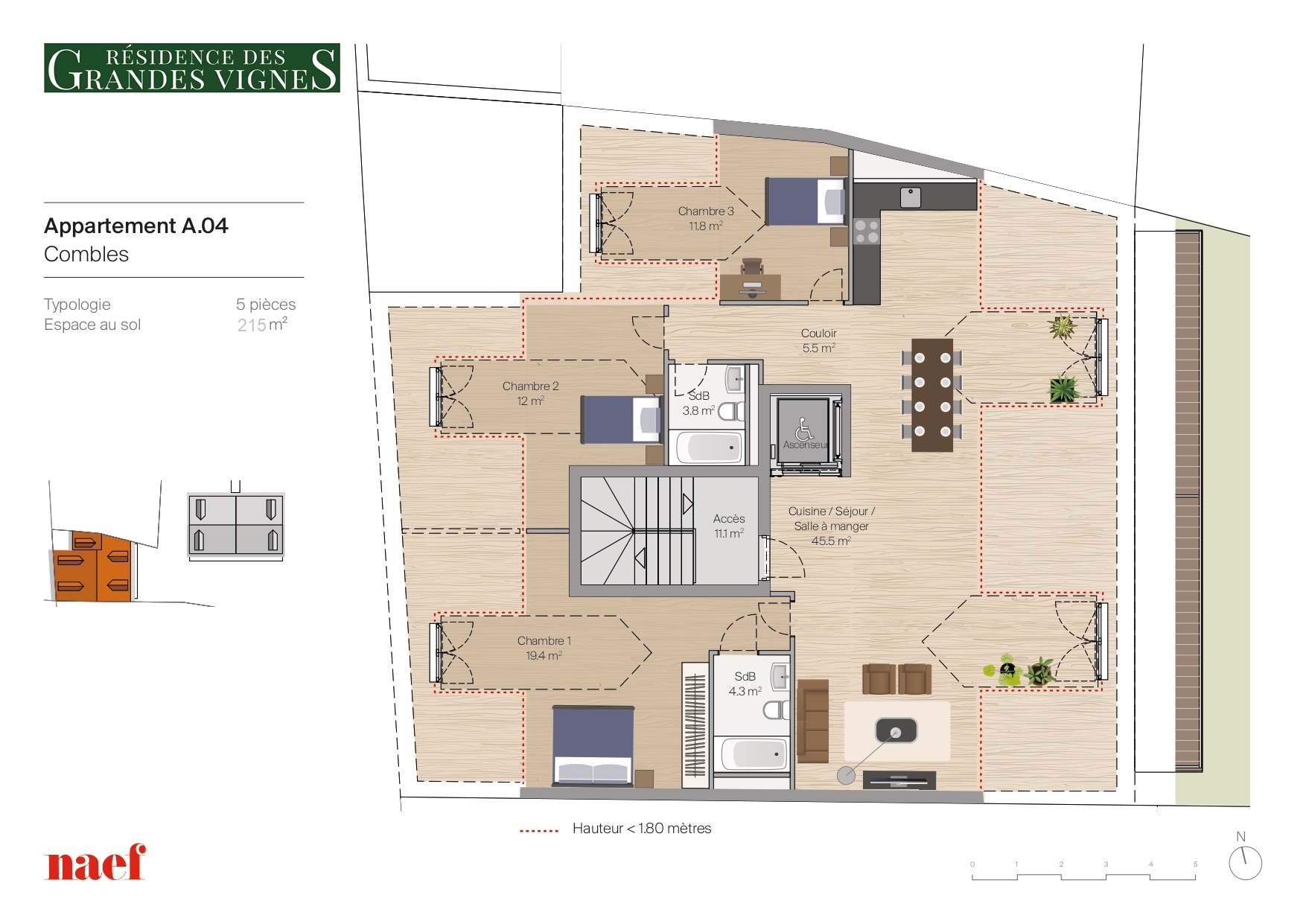 | A.04 | 5 | Combles | 215 m2 | vendu | ||||||